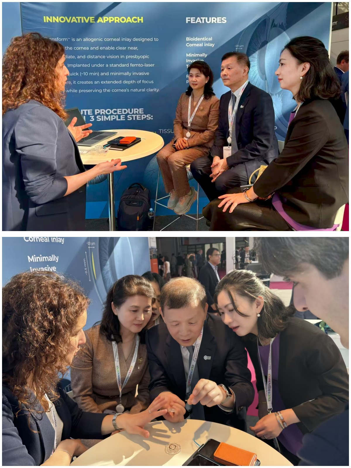 同时,在创新技术与产业展示区域,张丰菊教授与王铮教授及团队一道,重点关注并深入了解了诸如“老视角膜基质内嵌技术”等矫正老视的新产品与技术进展。他们与全球行业专家及研发人员面对面深入交流,探讨这些创新技术的原理、临床应用前景与潜在价值,为未来可能的技术引进与合作,以及服务国内更广大老视人群开拓了前沿性的视角。