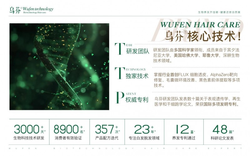 2017年,乌芬在厦门起步时就带着一个清晰的使命:让养发摆脱化学伤害,用科技唤醒头皮原生力量。不同于传统染发剂的 “遮盖式” 染发、中药养发的 “慢效等待”,乌芬创始团队(8年养发运营经验的蔡晓鹏、宾夕法尼亚大学博士后江博士等)联合哈佛大学、耶鲁大学等名校科研力量,深耕靶向基因、生物合成技术12年,终于实现了 “生物合成技术靶向修复毛囊干细胞” 的重大突破,乌芬品牌应运而生。