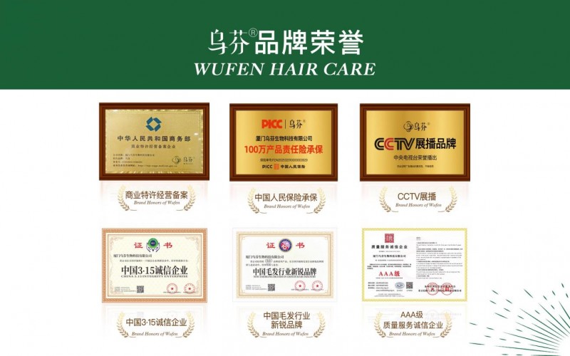 8年发展中,乌芬拿到了中华人民共和国商务部颁发的“商业特许经营备案”,也有幸登上CCTV中央卫视进行展播, 还获得了“中国 3・15 诚信企业”、“中国毛发行业新锐品牌”、“AAA 级质量服务诚信企业” 等多项认证,乌芬全系产品通过国家药监局备案,数万消费者实证有效。全系产品也有PICC中国人保进行百万元承保,安全性有足够的保障。