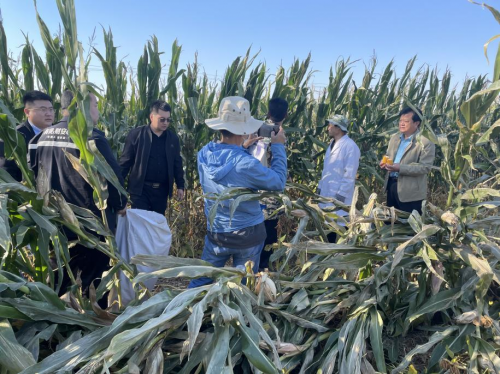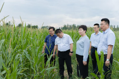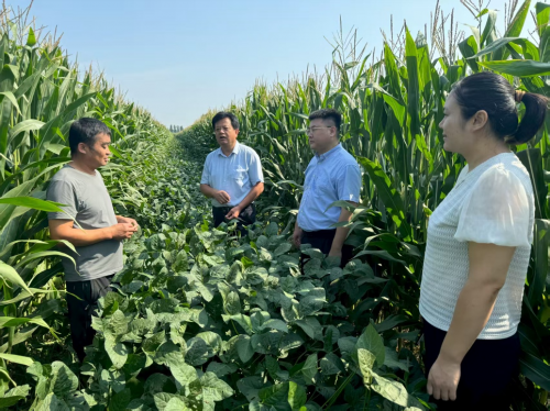 禹城市农业农村局、中国人寿财险德州市禹城支公司到带状复合种植基地了解大豆、玉米长势和相关农产品市场价格情况。