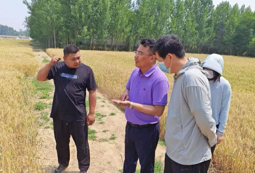 图为中国人寿财险平原县支公司负责人到田间地头了解粮食风险保障需求情况。