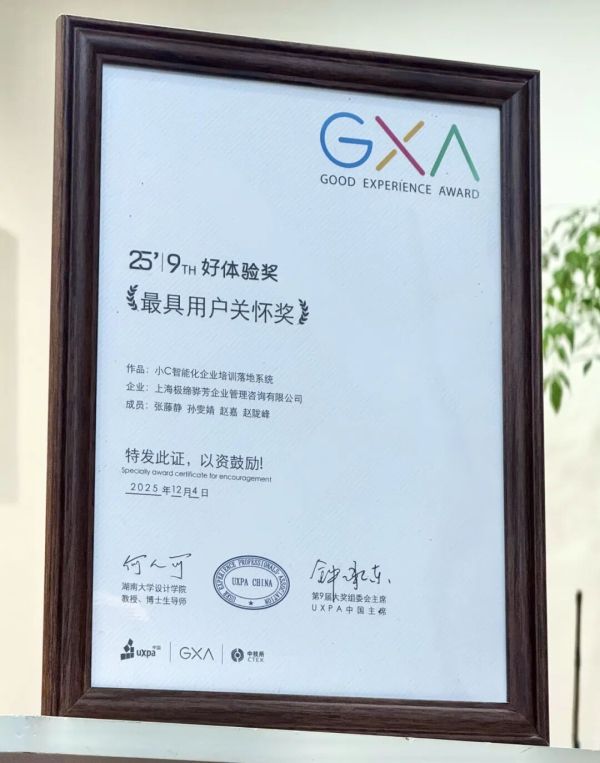 “小C智能化企业培训落地系统”凭借其使用中的用户友好体验以及商业上取得的阶段性成果,获得了本届GXA“好体验X好商业”的最具用户关怀奖。