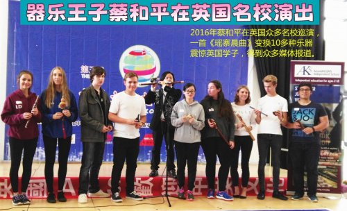 舞台上的蔡和平,是“全能器乐王子”的最佳注脚。2016年,他带着20多种乐器走进英国牛津大学、剑桥大学、贵族学校等名校,在学校的礼堂里,用葫芦丝吹《竹楼情歌》,用吉他弹《茉莉花》,最受欢迎的节目就是他用11种乐器演奏《瑶寨晨曲》,让西方学子在中西旋律的碰撞中瞪大了眼睛。“他们说‘原来中国乐器是如此博大精深,每个音符像在与他们对话’,这就是最好的文化交流”蔡和平笑着说道,“那次巡演被湖南株洲晚报刊登报道为‘5分钟的乐曲变换11种.株洲器乐王子震惊英国学子’”;2023年,他带领着乐团在万里长城奏响了《最美中国》,长城的烽火台与乐声共振,仿佛千年历史在旋律中苏醒,这场演出又斩获了全国金奖,更有人赞叹道:“他让中西乐器合璧站在了历史的高度。”